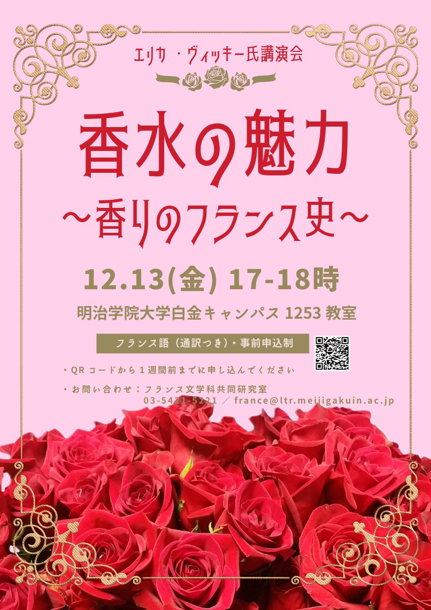 12月13日(金)17時から、明治学院大学白金キャンパスにて、嗅覚の歴史を専門とするエリカ・ヴィッキー(グルノーブル大学研究員)の講演会を行います。
